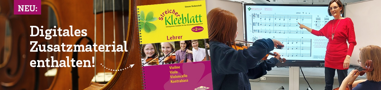 Das neue digitale „Streicher-Kleeblatt “ für die Lehrkraft, inklusive Verlinkung zu Klavieraufnahmen (VHR 3909) und zu 80 interaktiven Online-Spielen, ist ab sofort mit Gratis-Download-Code im Lehrerband (VHR 3901) enthalten.